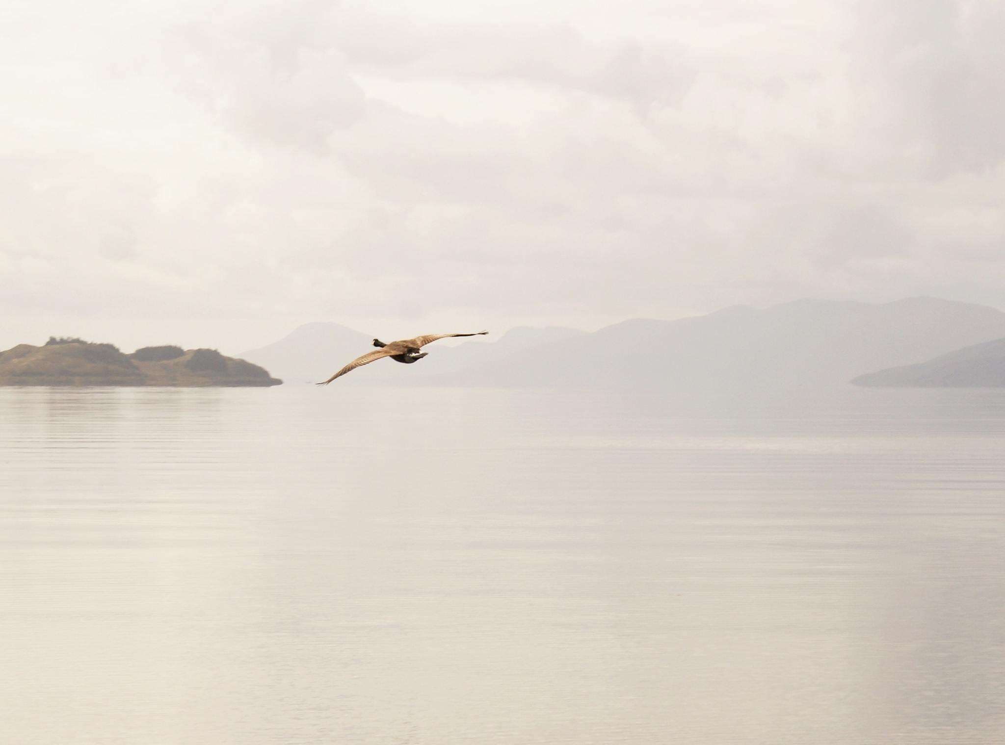 This photograph was taken in Scotland. The peaceful, simple seascape and gliding bird represent the stillness of my mind during meditation, which I practice for wellbeing - it makes me feel better and happy.