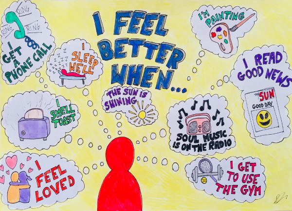 ‘Creativity offers us the opportunity for questioning and adjusting the way we view our world.It can change the way we think in a deep way. Koestler was not wrong when he said “The prisoners worst enemy is boredom and the slow death of thought.” Engaging in the arts encourages thinking. It presents challenges, giving voice to both the individual and the community. Attitudes can be altered through the sharing of purpose and resulting achievements. The ‘I Feel Better When’ works in The HMP Leicester Yellow Book by Rethink Your Mind are gifts from one person to another and remind us all of the talent and potential that can remain invisible if we choose not to look.’